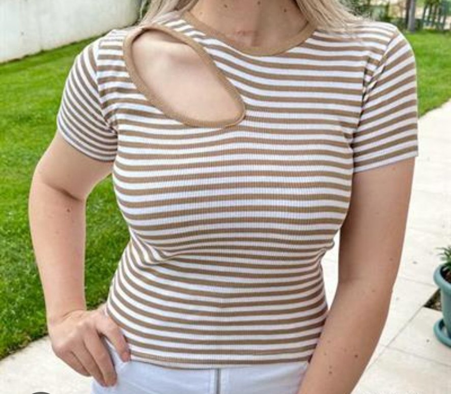 Vizon ve beyaz çizgili, kısa kollu ve tekne yaka, dantel detaylı, rahat kesim kadın tişörtü. Sentetik yumuşak kumaştan, günlük sokak stiline uygun.