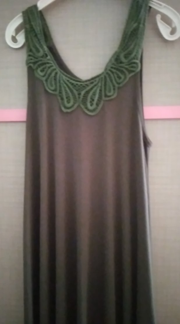 Dantel detaylı V yakalı, haki i uzun elbise. Örgü kumaştan, kolsuz ve bol kesim. Bohem tarz için uygun.