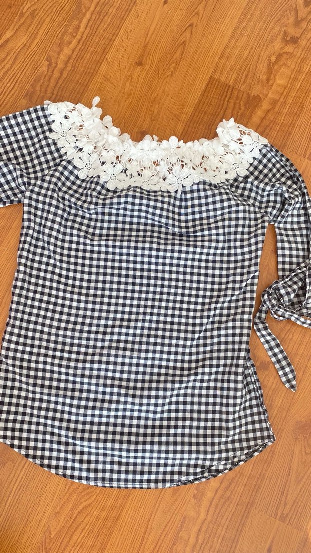 Pamuklu, kareli desene sahip, dantel detaylı kayık yaka ve uzun kollu bol kesim bluz. Günlük kullanıma uygun.