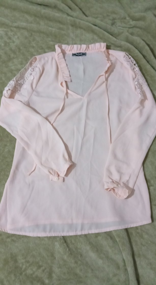 yavruagzi pastel renkte, dantel detaylı kolları ve V yakası olan kadın bluzudur. Uzun kollu, bol kesim ve normal midi boydadır. Yumuşak sentetik kumaştan üretilmiştir. Günlük rahat kullanım için uygundur. kol dantel detaylı