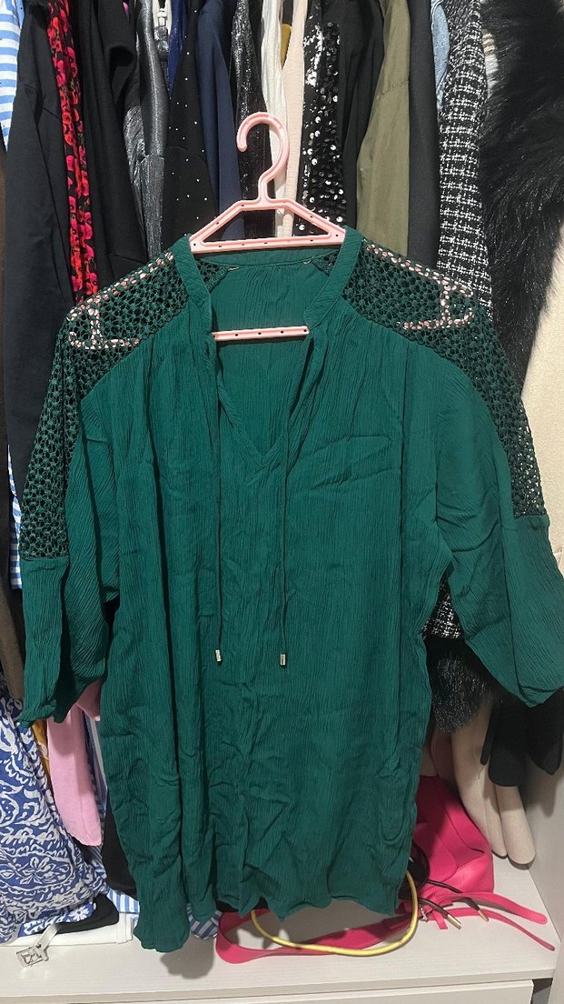 Yeşil bohem tarzda, dantel detaylı, uzun kollu, V yakalı, bol kesim gömlek. Yumuşak sentetik kumaştan, günlük kullanıma uygun. 42 -44 bedn