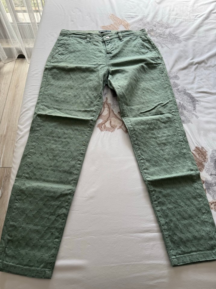 Dantel detaylı, normal boy, yeşil erkek pantolon. Pamuklu, rahat kesim, günlük kullanıma uygun.