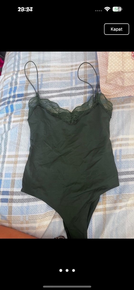 Dantel detaylı, ince askılı ve sade tasarımlı koyu yeşil günlük kullanıma uygun.