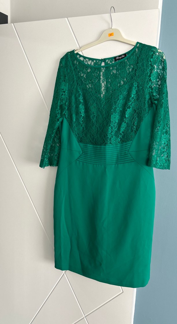 Dantel detaylı, üç çeyrek kollu yeşil abiye elbise, modern klasik ve vintage tarzı birleştirir, düğünler için uygundur.