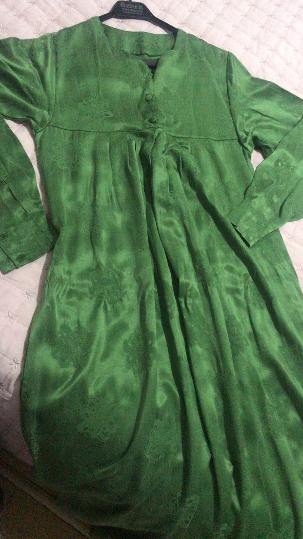 parlak yeşil saten dokusu ve dantel detaylarıyla bohem tarzını yansıtıyor. İpek kupra elbıse #kupraelbise