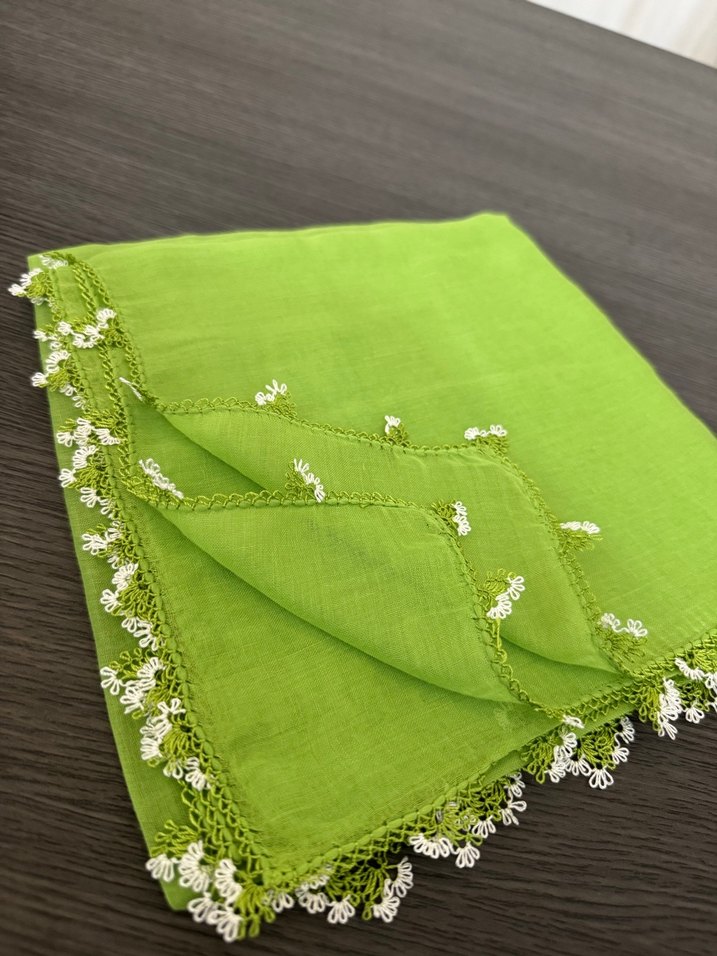 Dantel işlemeli kenarlarıyla yeşil renkli, yumuşak kumaştan kadın fuları. Parlak ve sade bohem tarzda.