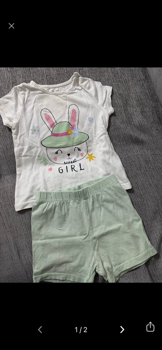 Pastel yeşil renkli, kısa kollu, dantelli ve baskılı tavşan desenli üst ile rahat şorttan oluşan kız bebek takımı. Üstte "GIRL" yazısı bulunur.