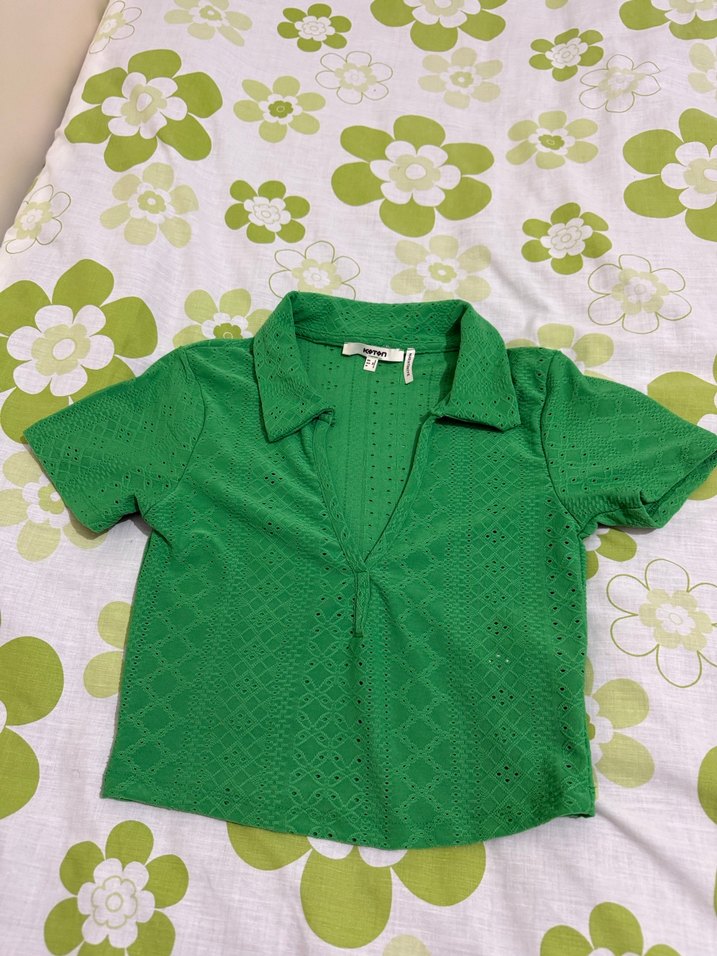 Kısa kollu, V yaka ve dantel detaylı, yeşil renkli, dar kesim kız bluzu. Trendy ve rahat sokak stili için uygundur.