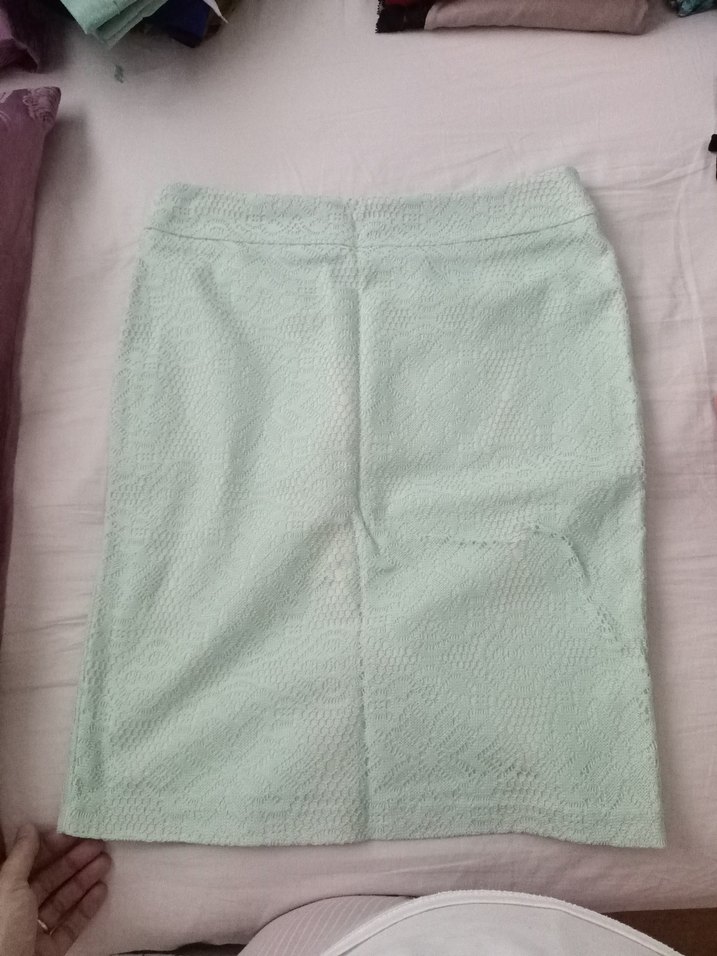 Dantel detaylı, pastel yeşil midi kalem etek. Yumuşak sentetik kumaştan, minimalist tasarım, günlük sokak stiline uygun.