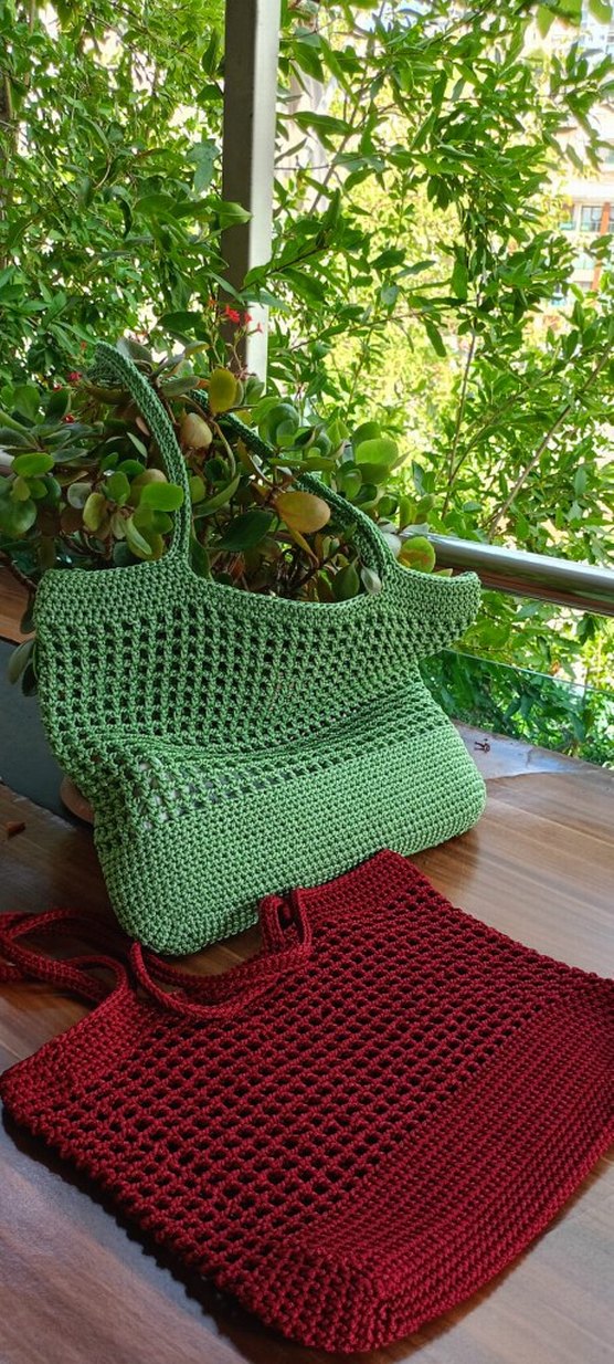 Yeşil renkli, dantel detaylı örgü kadın çanta. Bohem tarzı ve sade tasarımı ile günlük kullanıma uygun, rahat ve renkli bir aksesuar.
