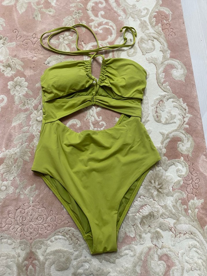Dantel detaylı, yeşil renkli, strappy kollu ve vücuda oturan mayo. Minimalist bohem stilinde, normal midi boyda ve desensiz plaj kullanımı için uygun.