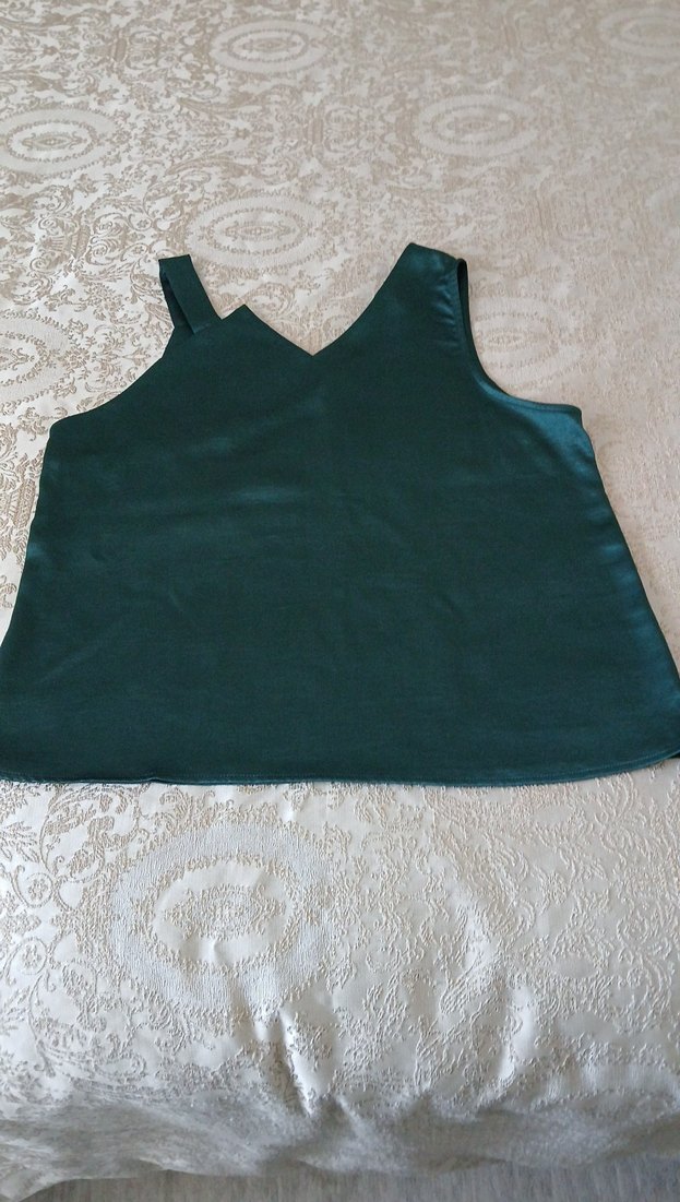 Dantel detaylı, V yakalı, askısız bluzu. İpek gibi kumaştan, parlak yeşil renkte, midi boyda ve bol kesimdir. Parti için uygundur.