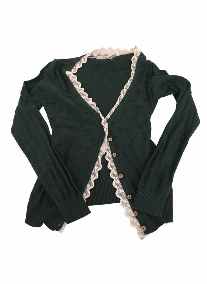 Fitted kesim, uzun kollu yeşil triko hırka, V yaka ve dantel detaylı. Normal midi boyda, vintage goth tarzında, günlük kullanım için uygundur.