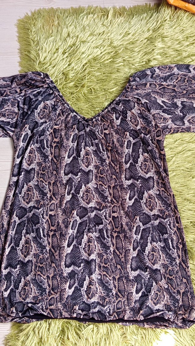 V yaka, uzun kollu, bol kesim yılan desenli kahverengi ve gri bluz. Dantel detaylarıyla bohem tarzı yansıtır.