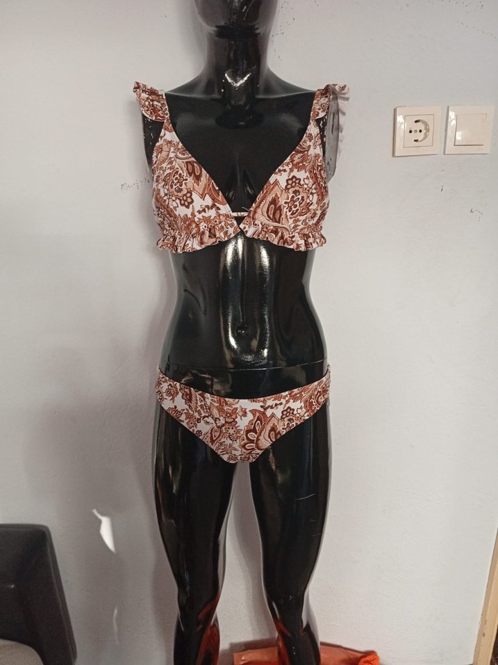 Dantel detaylı, yılan desenli, kolları askılı, vücuda oturan mini bikini. Bohem tarzda, dış mekan kullanımı için uygundur.