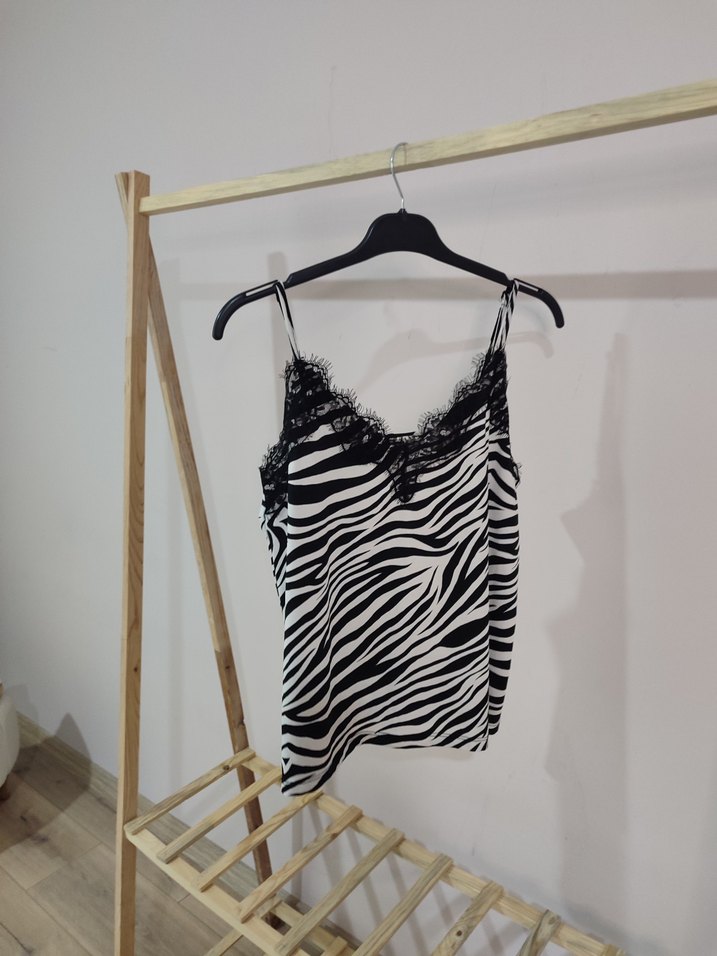 Siyah beyaz zebra desenli mini askılı bluz, straplez yaka ve ince askılarla dantel detayına sahip. Rahat kesim ve yumuşak sentetik kumaş kullanılmış.
