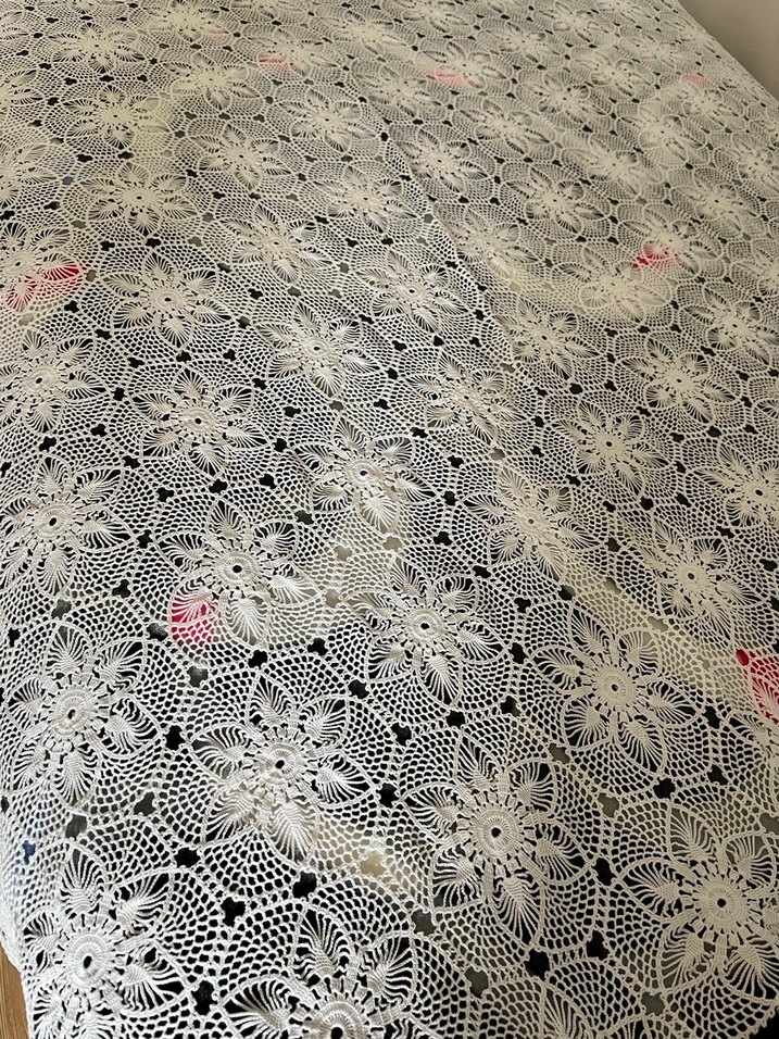 El yapımı, beyaz iplikle işlenmiş karmaşık bohem çiçek desenli dantel masa örtüsü. Ebatlar 170x150