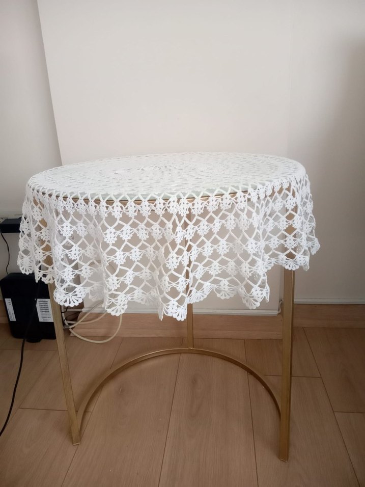 İnce detaylı beyaz örgü masa örtüsü, masanıza zarif bir dokunuş katmak için uygundur. Ürün el işidir ve hiç kullanılmamıştır. Örtü yuvarlak şekilde olup çapı 82 cm dir.