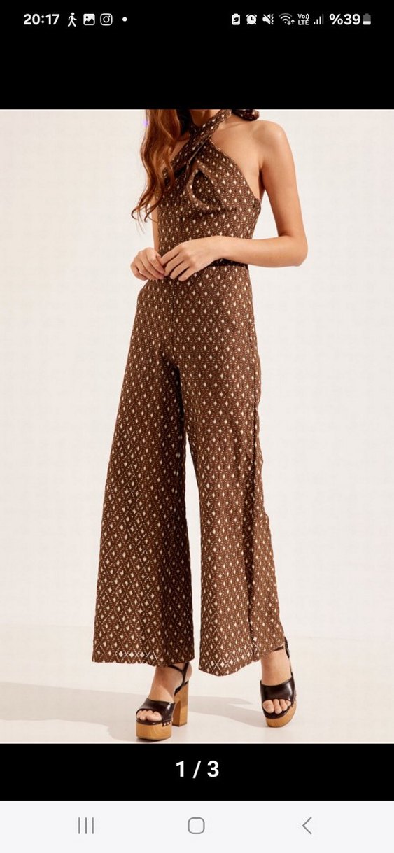 setre marka Kahverengi, fit kesim kadın tulumu, dantel ve puantiyeli desenlerle süslenmiştir. Askılı ve straplez yakalı, pamuklu kumaştan, bohem tarzda romantik akşamlara uygun.
