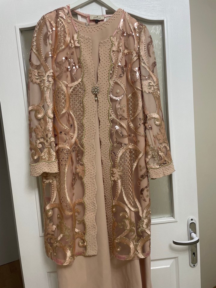 Bej renkli, dantel işlemeli, parlak detaylara sahip uzun abiye elbise. Notched lapel yakalı ve uzun kolludur, klasik vintage tarzda düğün için uygundur.