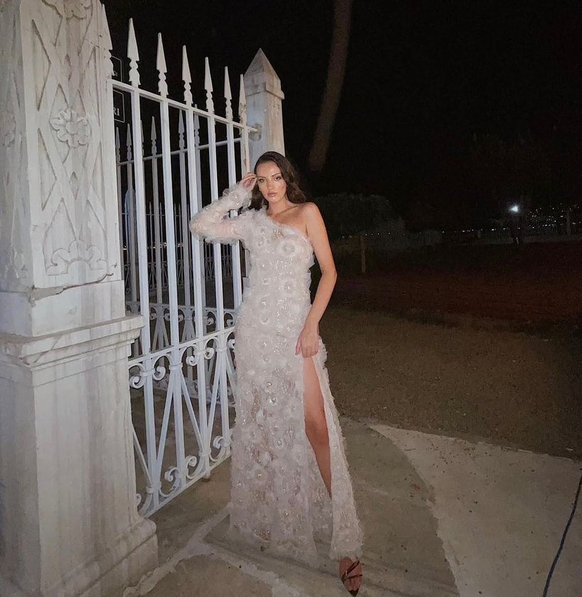 Dantel işlemeli uzun abiye elbise, straplez yakalı ve ince askılıdır. Bohem ve şık tarzıyla düğünler için uygundur.