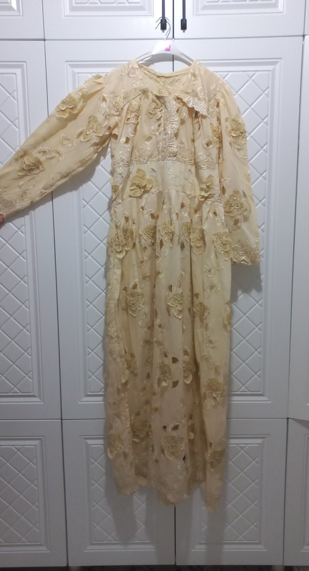 Astarsızdır.Bej renkli uzun dantel işlemeli vintage elbise, yakasında kesik yaka detayı bulunur. Uzun kollu ve bol kesimdir . Düğün için uygundur.