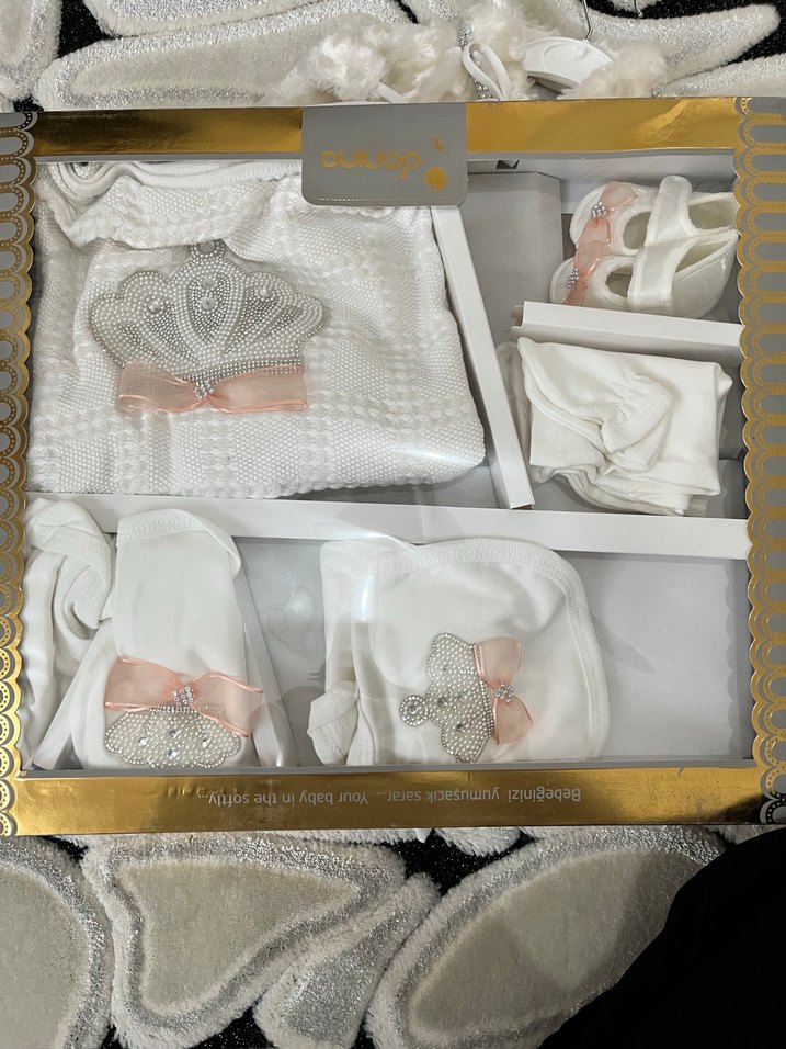 Dantel ve işlemeli desenlere sahip beyaz bebek hastane çıkışı, uyumlu eldiven ve patikler şık fiyonklarla süslenmiş.