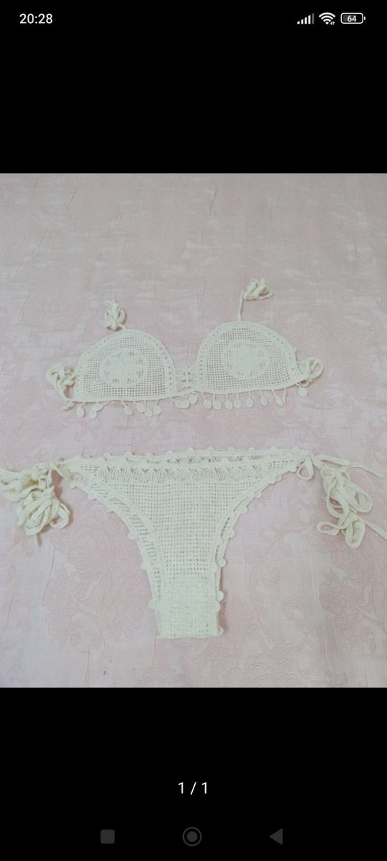 Dantel ve işlemeli detaylara sahip, bağcıklı askılı beyaz bohem tarzında, vücuda oturan bikini. Plaj için uygun midi uzunlukta.