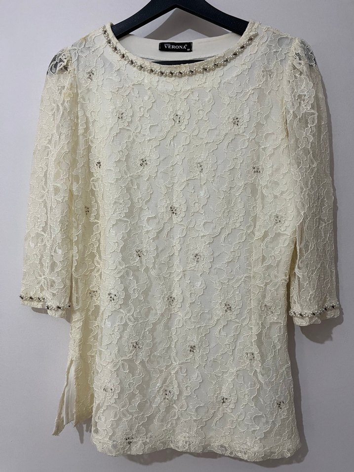 Dantel ve işlemeli detaylara sahip beyaz bluz, yakasında ince süslemeler ve üç çeyrek kolludur. Bol kesim, klasik vintage bohem tarzda. Sağ kol kısmında biraz Sarar’tı var ama geçirilebilir