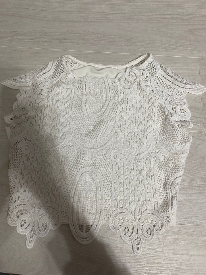 Dantel işlemeli beyaz, kolsuz, tekne yaka kısa bluz. İnce ve vücuda oturan kesimiyle günlük kullanım için uygun, bohem tarzda.