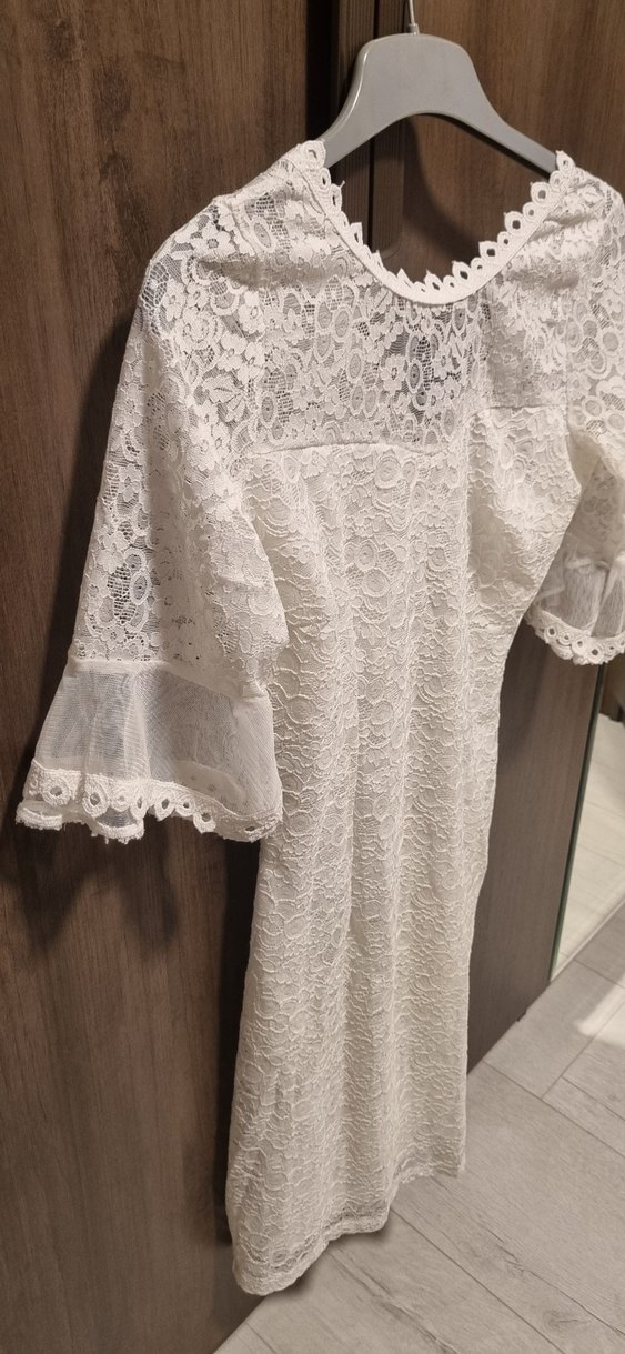 Dantel ve işlemeli detaylara sahip, tekne yaka ve kısa kollu, beyaz ve vücuda oturan kısa nişan elbisesi. Vintage bohem tarzını yansıtır, yumuşak ve romantik bir görünüm sunar.