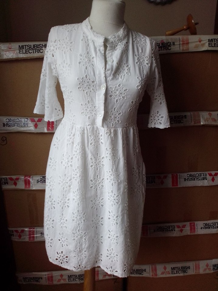 Dantel işlemeli beyaz bohem elbise, V yakalı ve kısa kolludur. Pamuk kumaştan, rahat ve bol kesimdir, günlük kullanıma uygundur. fisto kumaş elbise sorunsuz S ve M uyumlu arkadaşımın/crep marka