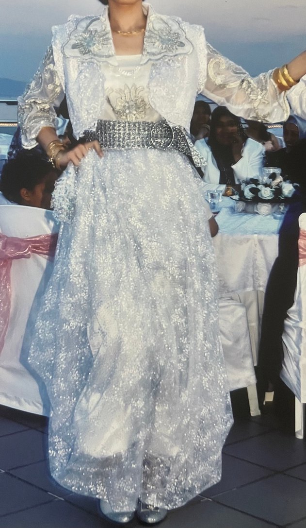Bu beyaz, askısız nişan elbisesi, işlemeli dantel ve bol kesimiyle bohem tarzını yansıtıyor, kolsuz tasarıma sahip. Boşnak Kına Dimija