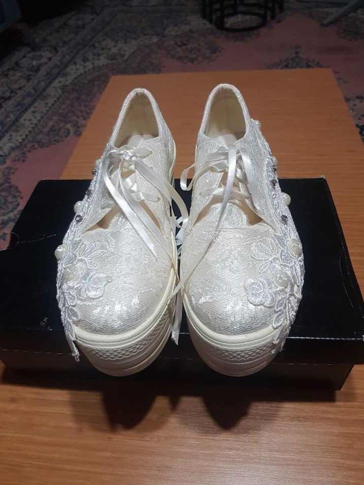 Beyaz dantel işlemeli ve kurdele bağcıklı dolgu topuklu kadın spor ayakkabısı, vintage tarz ve klasik zarafeti bir arada sunar. Dayanıklı kauçuk tabanlı.