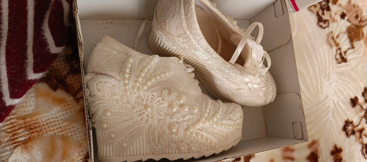 Dantel ve inci detaylı beyaz gelin ayakkabısı, vintage ve klasik şıklık sunar. bir saat Nikâh ta giyildi kutulu ürün