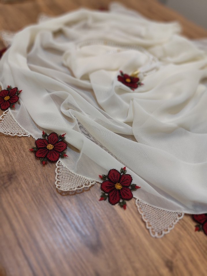 Bohem ve retro tarzı yansıtan, dantel detaylı ve kırmızı çiçek işlemeli açık beyaz tekstil kadın fuları.