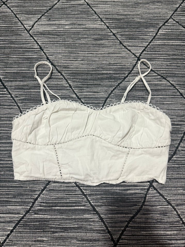 İnce askılı, straplez yakalı, dantel işlemeli beyaz keten büstiyer. Ve halter yaka Bohem tarzda, normal boyda ve günlük kullanıma uygundur.