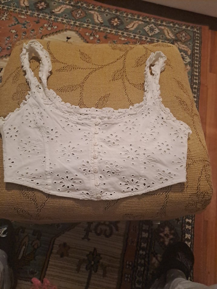 Dantel işlemeli, beyaz, tekne yaka, kolsuz ve pamuklu kumaştan yapılmış bohem tarzda, kısa ve dar kesim büstiyer.