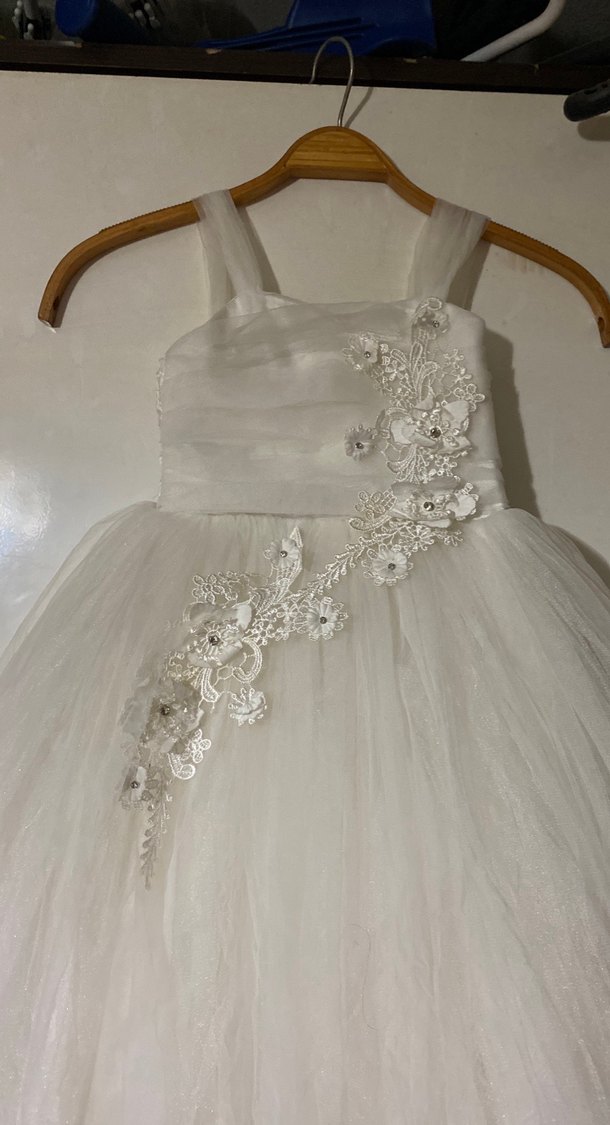 Dantel işlemeli, askılı, straplez yaka beyaz elbise, modern klasik tarzda, çocuklar için uyumlu kesime sahiptir.