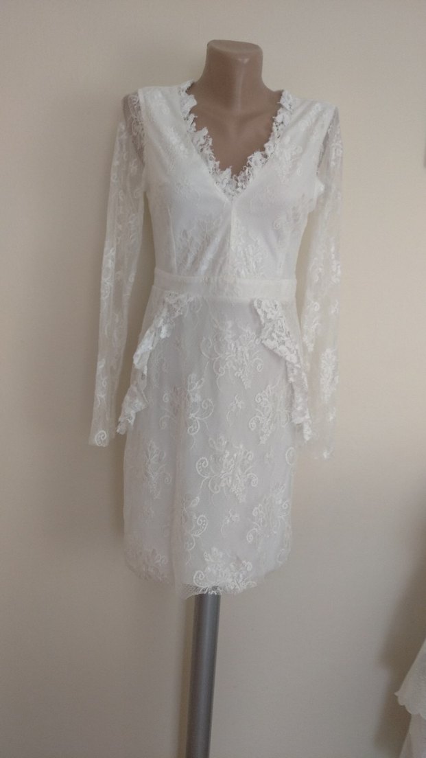 İnce işlemeli dantel detaylı, V yakalı, uzun kollu beyaz midi uzunlukta, klasik ve bohem tarzda abiye elbise.