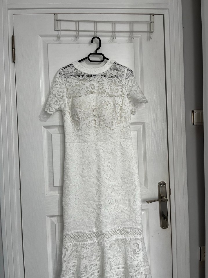 Dantel işlemeli beyaz midi abiye elbise, kısa kollu ve yuvarlak yaka detaylıdır. düğünler için nikah için mezuniyet için uygundur. Göğüs desteklidir astarlıdır
