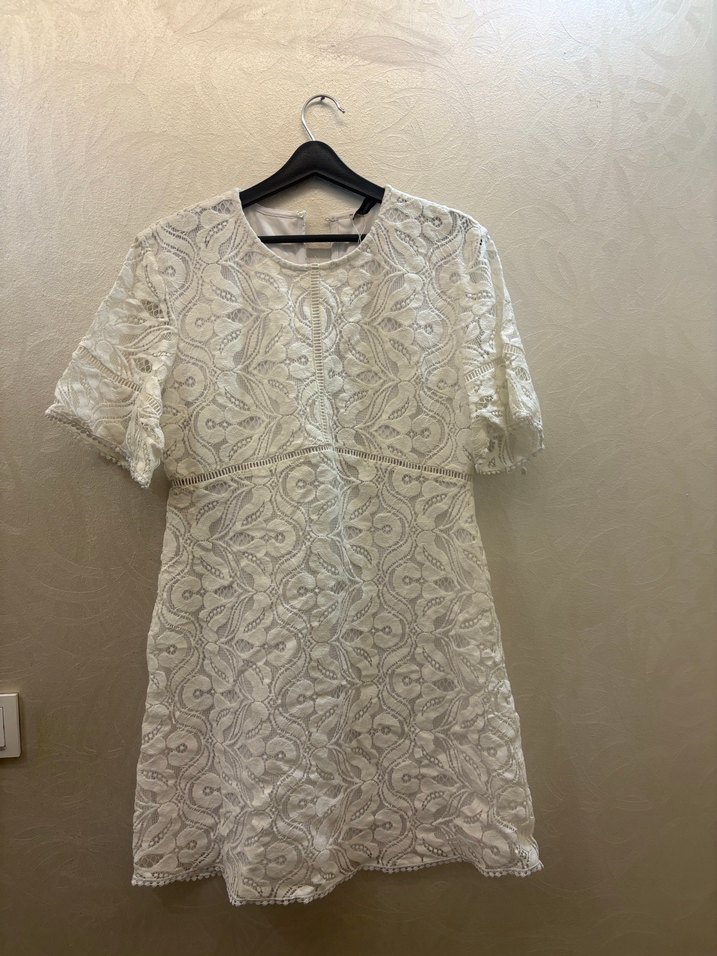 Dantel işlemeli, kısa kollu, V yakalı beyaz midi elbise. Bol kesimli, bohem tarzda, günlük kullanıma uygun.