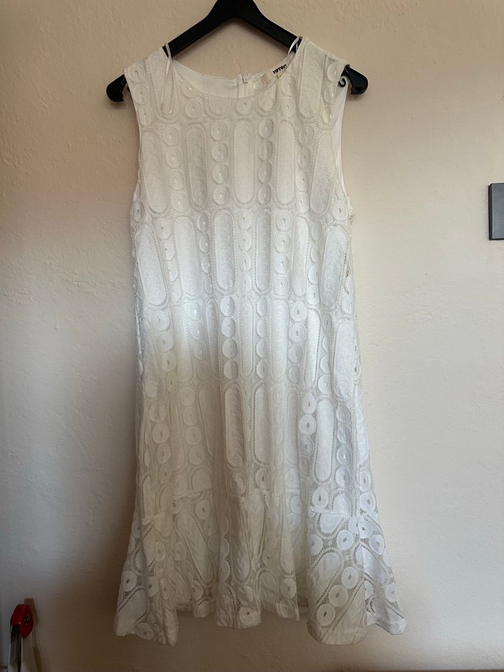 Dantel işlemeli, kolsuz beyaz midi elbise, bohem tarzda regular fit ve yuvarlak yaka ile. Düğünler için uygun. 2 kere kullanıldı bir sorunu yoktur.