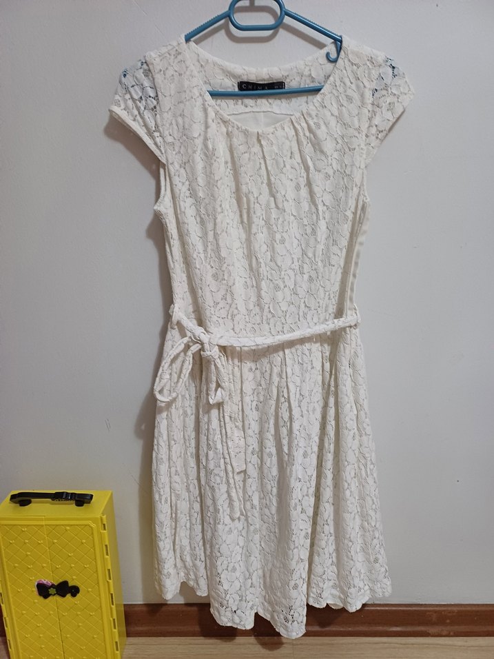 Beyaz midi elbise, dantel işlemeli, kemerli ve bol kesimdir. Kısa kollu ve yuvarlak yakalıdır, günlük veya düğün için uygundur.