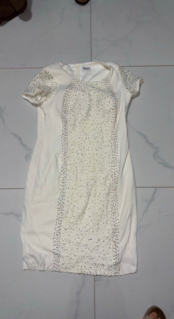 Ürün BİR KERE GİYİLDİ. 44 beden. İşlemeleri çık sağlam ve iyi işçilikle hazırlanmış Kısa kollu, yuvarlak yaka, dantel işlemeli beyaz midi elbise. Minimalist ve şık tasarımıyla düğünler için uygun.