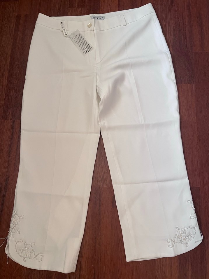 Beyaz, dantel işlemeli midi uzunlukta kadın kumaş pantolon. İpek gibi kumaştan, iş ve düğün için uygun, regular fit. Boy 82cm, bel iki dikiş arası 44
