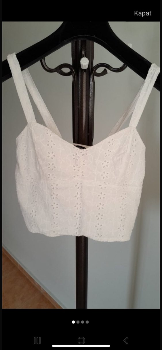 Pamuk kumaştan yapılmış, dantel işlemeli beyaz bustiyer. İnce askılı, straplez kesim ve kısa boyuyla bohem tarzda, günlük kullanıma uygun.