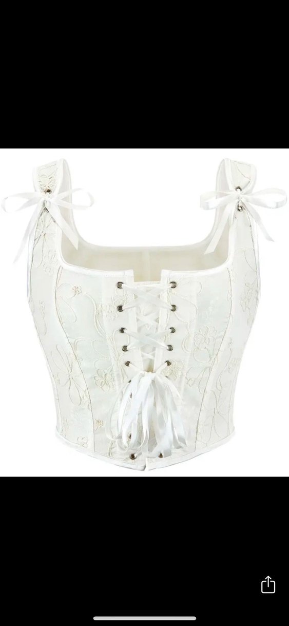 Korse . Dantel işlemeli, straplez yakalı beyaz bustiyer. Straplı askılar ve oturan kesim ile gotik tarzda, midi boyda.