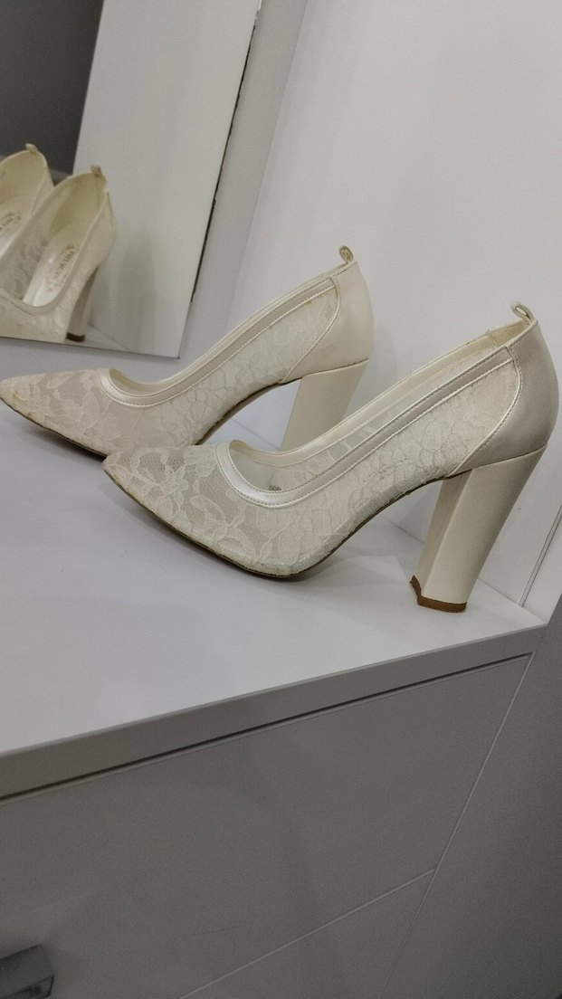 Dantel işlemeli beyaz topuklu kadın ayakkabısı, modern klasik tarzda ve düğünler için uygun. Dayanıklı kauçuk malzemeden üretilmiştir. Sadece 1 kere nikahımda giydim.