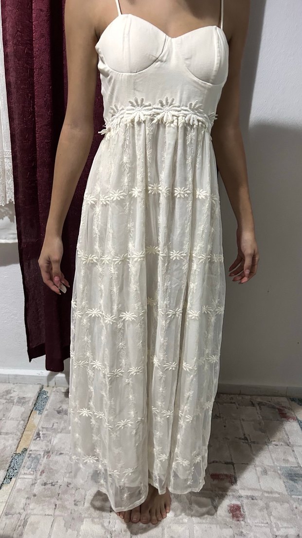 Beyaz, straplez, uzun elbise, işlemeli dantel detaylara sahip, yumuşak sentetik kumaştan, dantel kumaş altında astar mevcuttur, iç göstermez.
